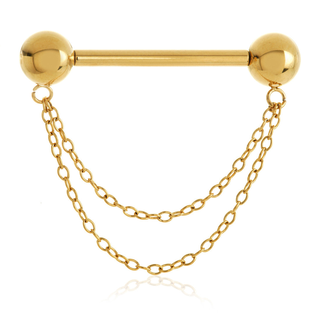 Threadless Zircon Gold Ti Plain Ball Double Chain Nipple Bar