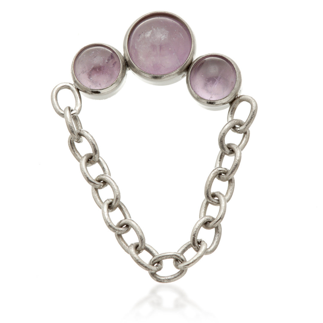 Titanium Internal Triple Amethyst Stone Bezel with Hanging Chain Attachment Gauge: 1.2mm (0.9mm thread) Attachment Size: 5mm x 10mm Stone Sizes: 3+4+3mm Chain Length: 20mm Stone: Amethyst Medical Grade Titanium 6Al-4VEli ASTM:F-136