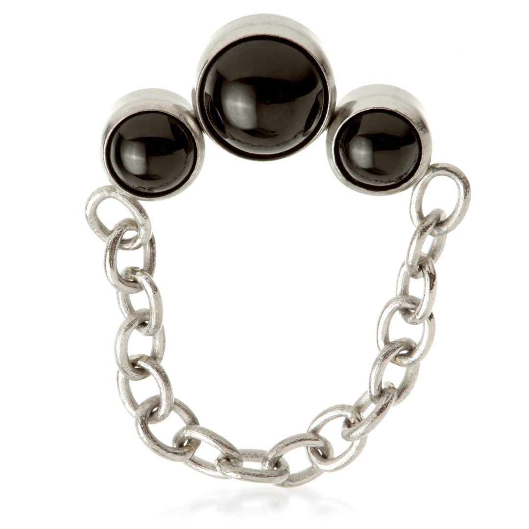 Titanium Internal Triple Black Agate Stone Bezel with Hanging Chain Attachment Gauge: 1.2mm (0.9mm thread) Attachment Size: 5*10mm Stone Sizes: 3+4+3mm Chain Lenght: 20mm Stone: Black Agate Medical Grade Titanium 6Al-4VEli ASTM:F-136