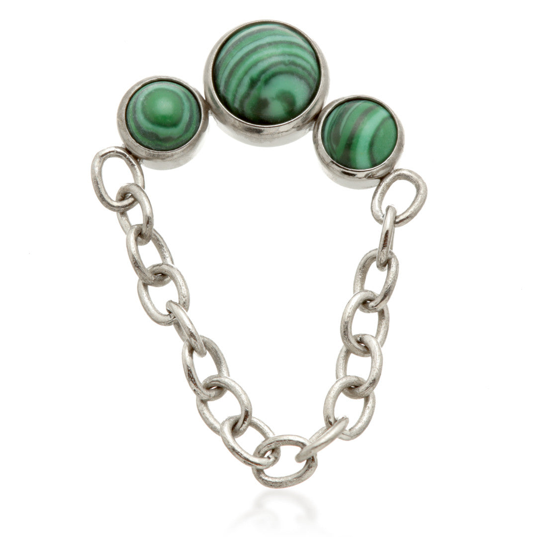 Titanium Internal Triple Malachite Stone Bezel with Hanging Chain Attachment Gauge: 1.2mm (0.9mm thread) Attachment Size: 5mm x 10mm Stone Sizes: 3+4+3mm Chain Length: 20mm Stone: Malachite Medical Grade Titanium 6Al-4VEli ASTM:F-136