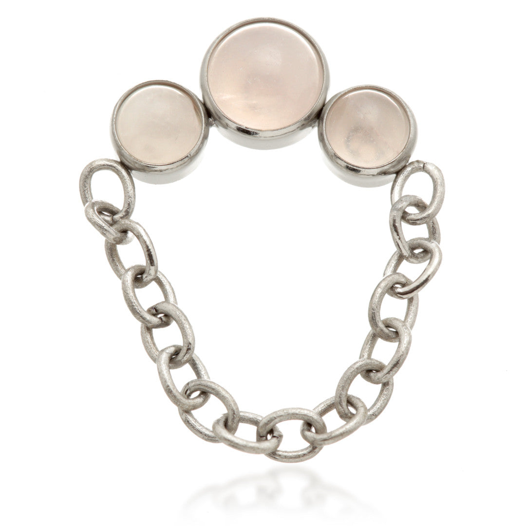 Titanium Internal Triple Rose Quartz Stone Bezel with Hanging Chain Attachment Gauge: 1.2mm (0.9mm thread) Attachment Size: 5mm x 10mm Stone Sizes: 3+4+3mm Chain Length: 20mm Stone: Rose Quartz Medical Grade Titanium 6Al-4VEli ASTM:F-136