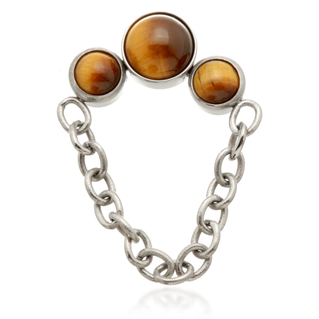Titanium Internal Triple Tiger Eye Stone Bezel with Hanging Chain Attachment Gauge: 1.2mm (0.9mm thread) Attachment Size: 5mm x 10mm Stone Sizes: 3+4+3mm Chain Length: 20mm Stone: Tiger Eye Medical Grade Titanium 6Al-4VEli ASTM:F-136