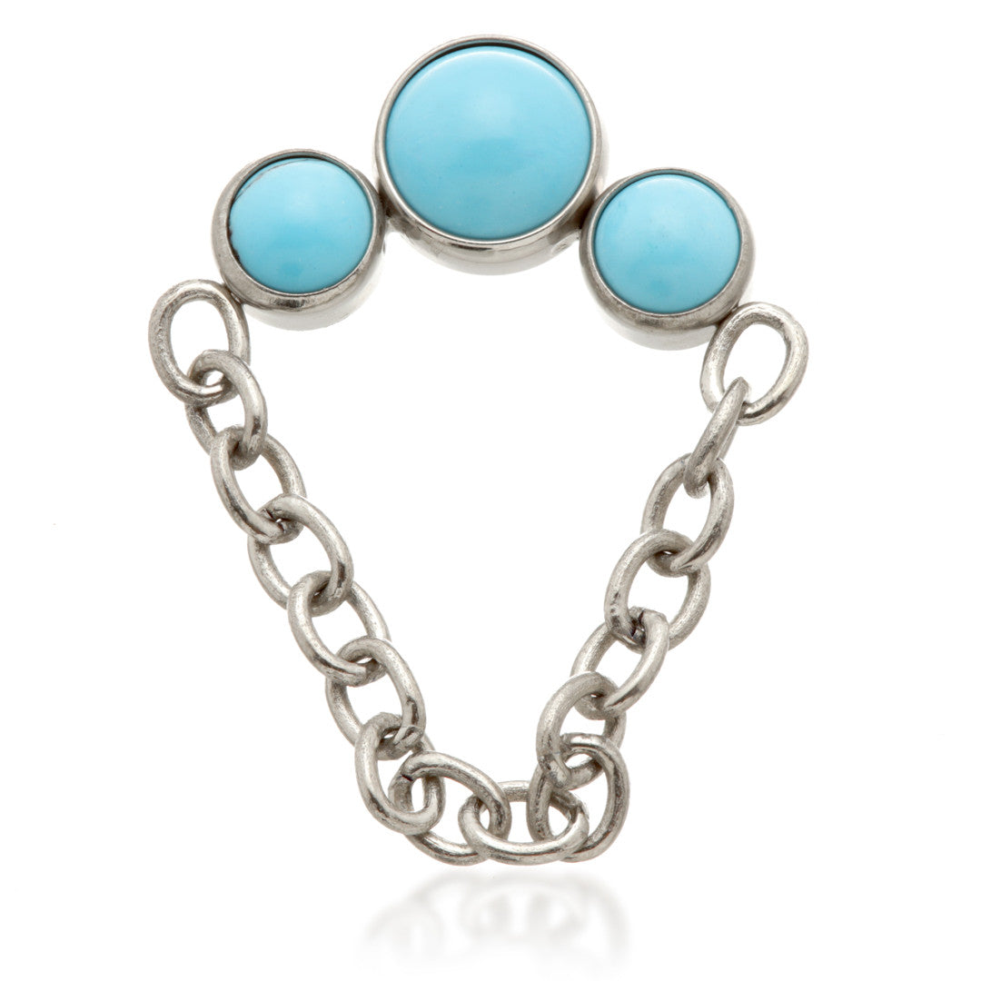 Titanium Internal Triple Turquoise Stone Bezel with Hanging Chain Attachment Gauge: 1.2mm (0.9mm thread) Attachment Size: 5mm x 10mm Stone Sizes: 3+4+3mm Chain Length: 20mm Stone: Turquoise Medical Grade Titanium 6Al-4VEli ASTM:F-136