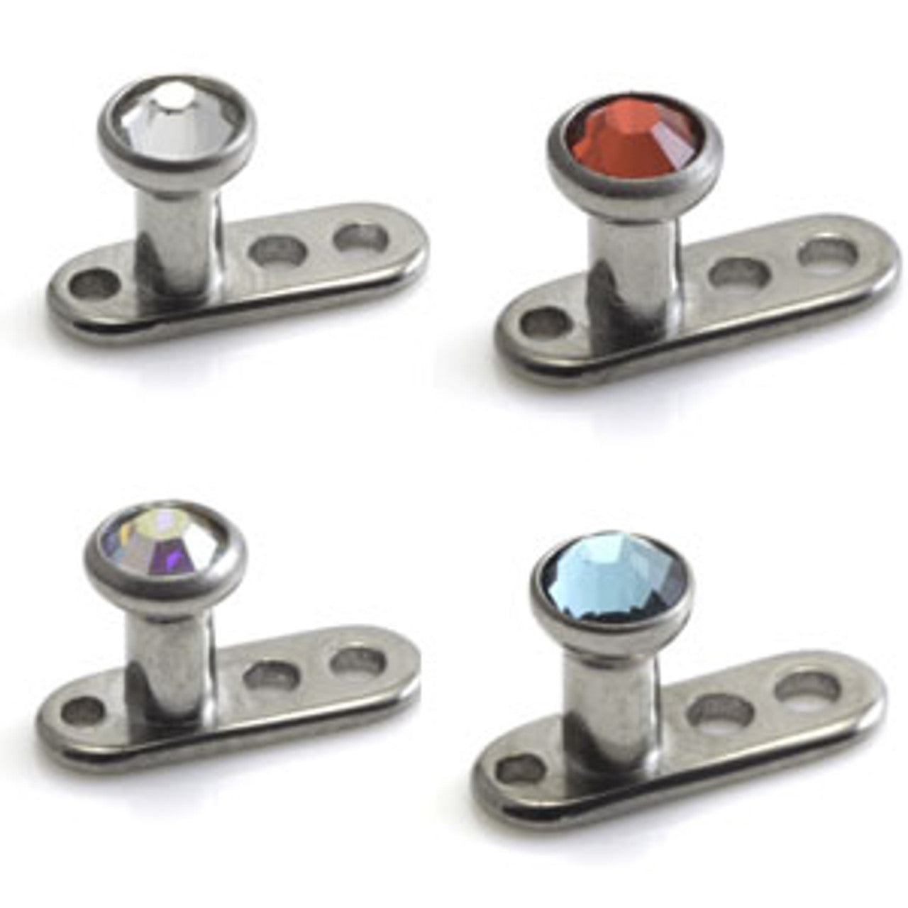 Premier Titanium Jewel Disk Dermal Anchor (internal thread) Dermal Anchor Height: 2mm or 2.5mm Gauge: 1.6mm Disk Sizes: 3mm, 3.5mm, 4mm, 5mm, 8mm Gem Colours: Crystal, AB, Amethyst, Aqua, BZ, Capri, Fuchsia, Jet, Lt Siam, Peridot, Rose, Sapphire