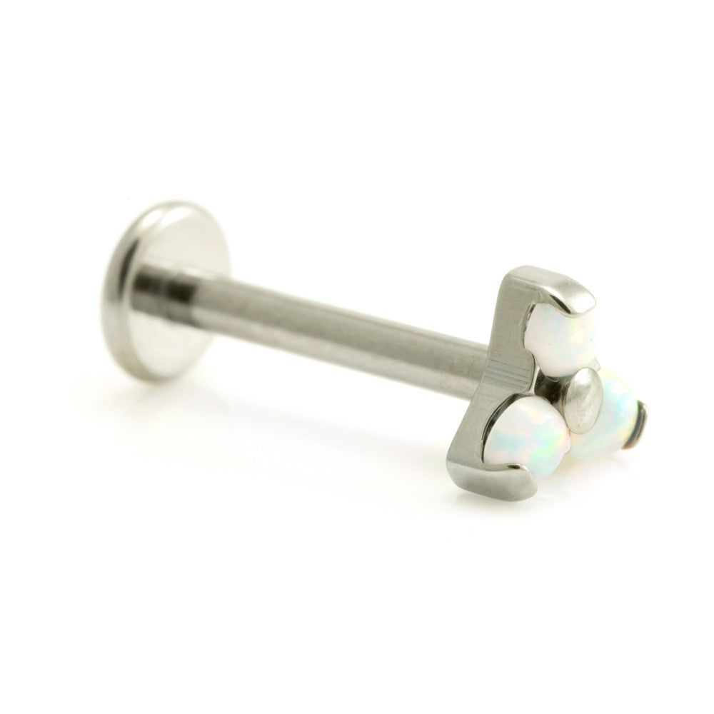 Titanium Labret with Trinity Opal Attachment Gauge: 1.2mm (thread 0.9mm) Labret Size: 8mm Opal Colour: Blue or White Attachment Size: 5mm Swarovski Crystal Gem Stones Fits all QDD attachments Medical Grade Titanium 6Al-4VEli ASTM:F-136