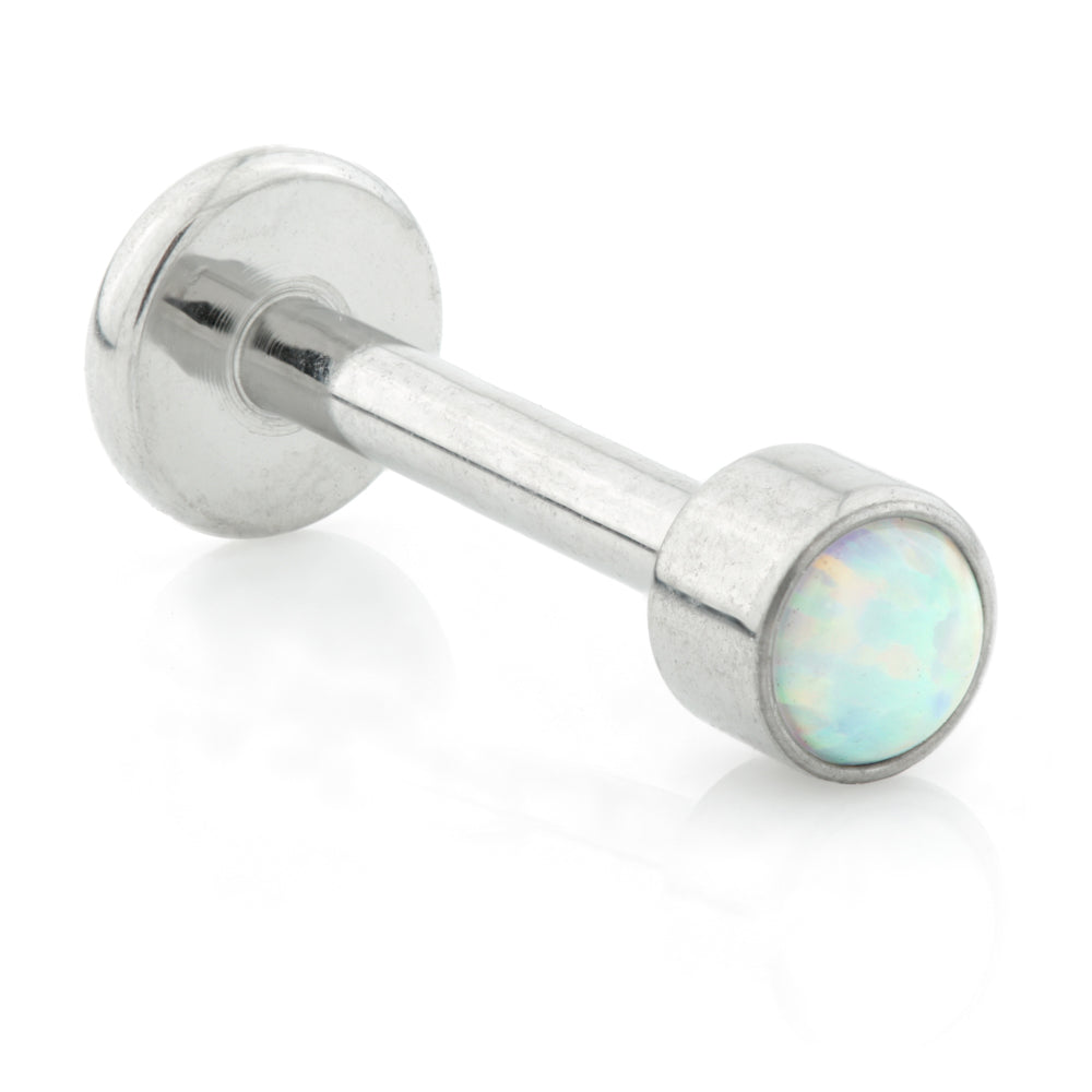 Titanium Labret with Opal Bezel Set Disk Gauge: 1.2mm (thread on Disk 0.9mm) Labret Size: 8mm Opal Colours: White or Blue Disk Size: 3mm Medical Grade Titanium 6Al-4VEli ASTM:F-136