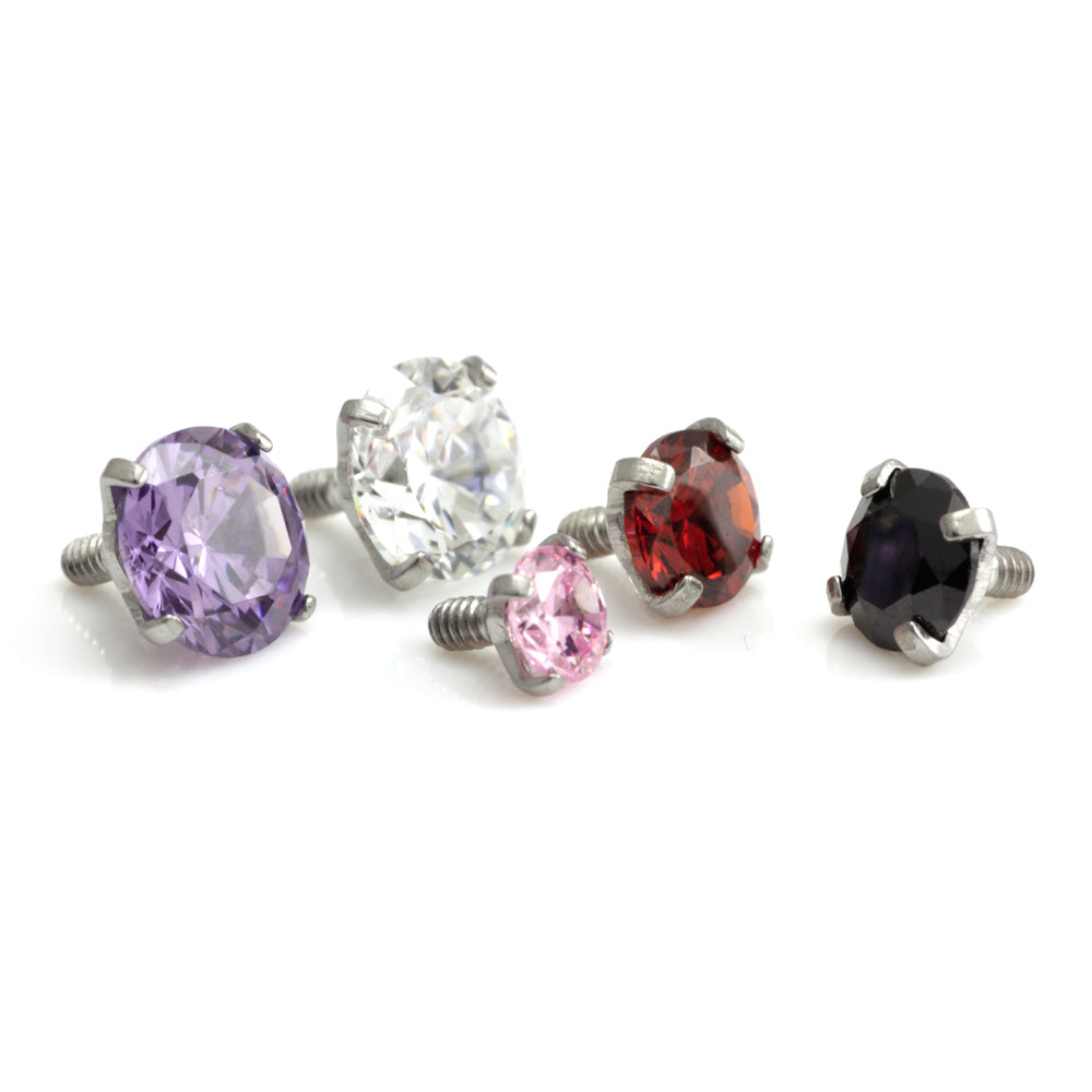 Internal Steel Prong Gem Fits onto 1.6mm internal thread open dermal anchor base, discount dermal anchor base, Q-internal jewellery or flat surface bars Sizes: 2mm, 2.5mm, 3mm, 4mm & 5mm Gem Colour: Crystal, Pink, Purple, Black, Red, Li Fits Gauge: 1.6mm (thread on Gem 1.2mm)