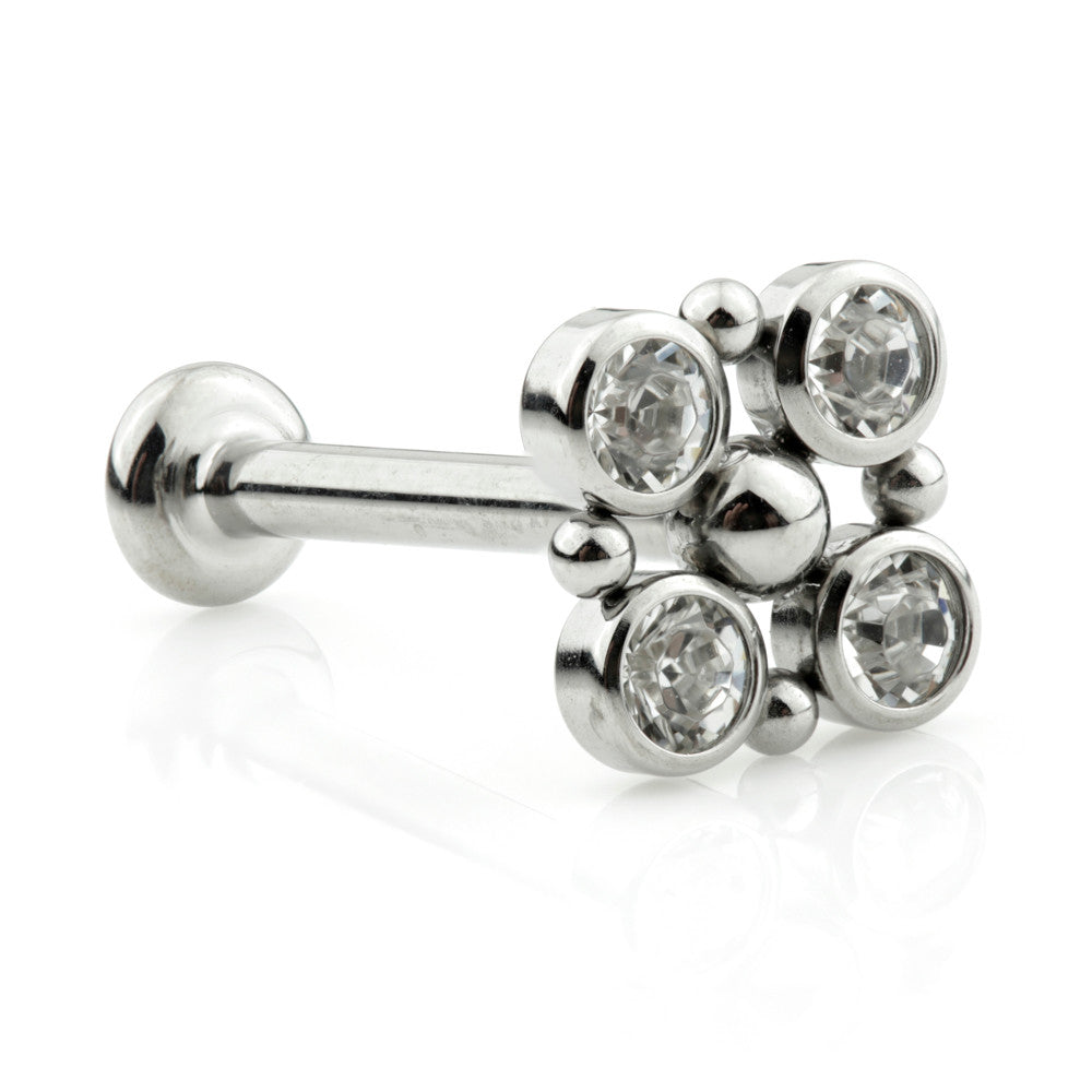 Gem Dot Top Labrets Size: 1.2mm x 5/6/7/8/10mm Disk Size: 5mm (0.8mm Thread) Labret Base: 3mm Gem Size: 2.5mm (x4) Gem: Swarovski Crystal Fits iLab's and MDD disks Interchange with MDA anchors and disks. Medical Grade Titanium 6Al-4VEli ASTM:F-136