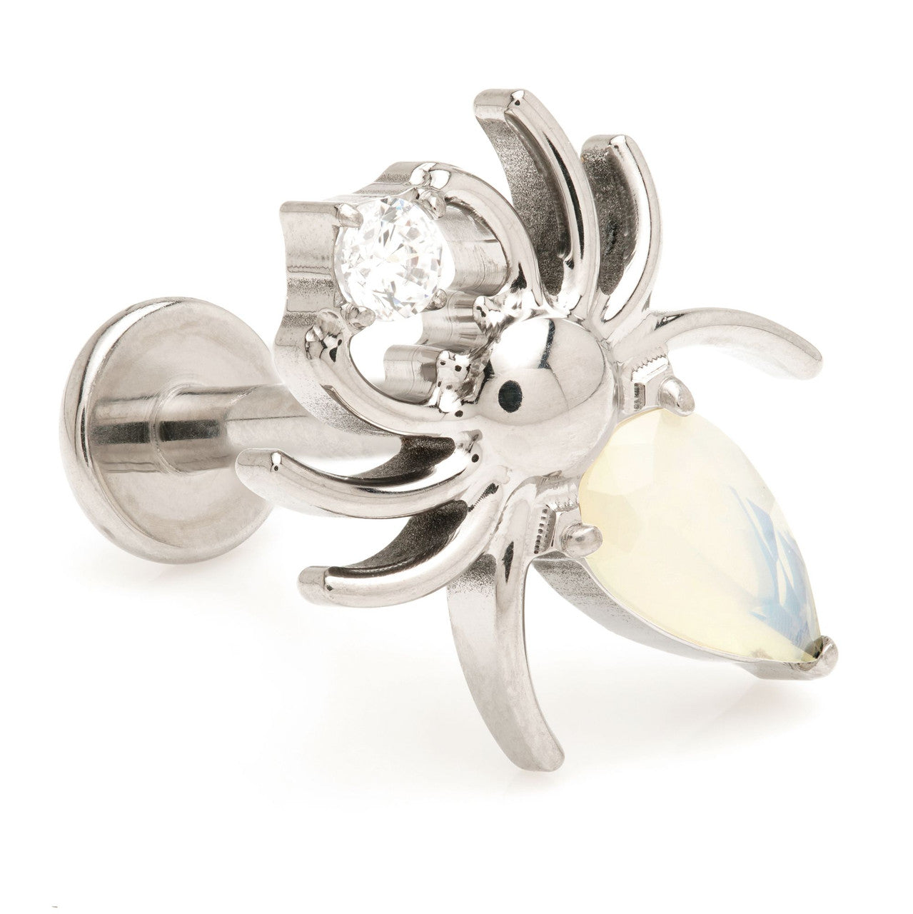 Ti Internal Jewelled Tarantula Labret </br> </p> Gauge: 1.2mm (0.9mm thread)</br> Size: 8mm </br> Attachment Size: mm </br> Gem Colour: Crystal & Opalite </br> </p> Medical Grade Titanium 6Al-4VEli ASTM:F-136 </p>