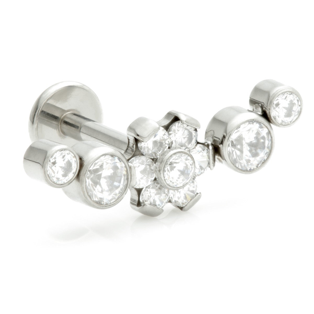 Titanium Internal Labret with Bezel Cluster with Flower Center Attachment Gauge: 1.2mm Sizes: 6mm / 8mm Gem Colour: CR CZ Gem Stones Medical Grade Titanium 6Al-4VEli ASTM:F-136