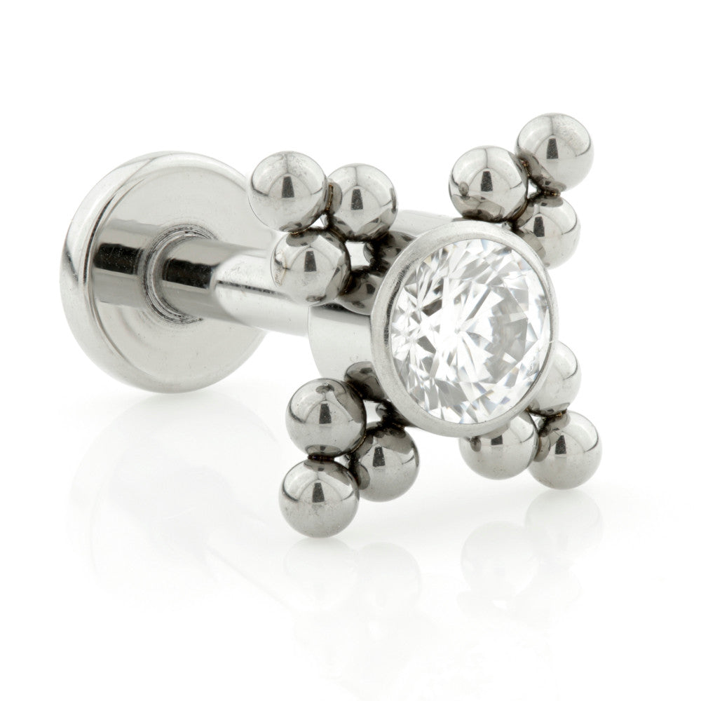 Internal Ti Labret with 3.5mm Disk Gem with 4 Triplet Balls Surround Labret: 6/7/8mm Gem Size: 3.5mm (0.9mm Thread) Gem: Crystal Fits US Thread Medical Grade Titanium 6Al-4VEli ASTM:F-136