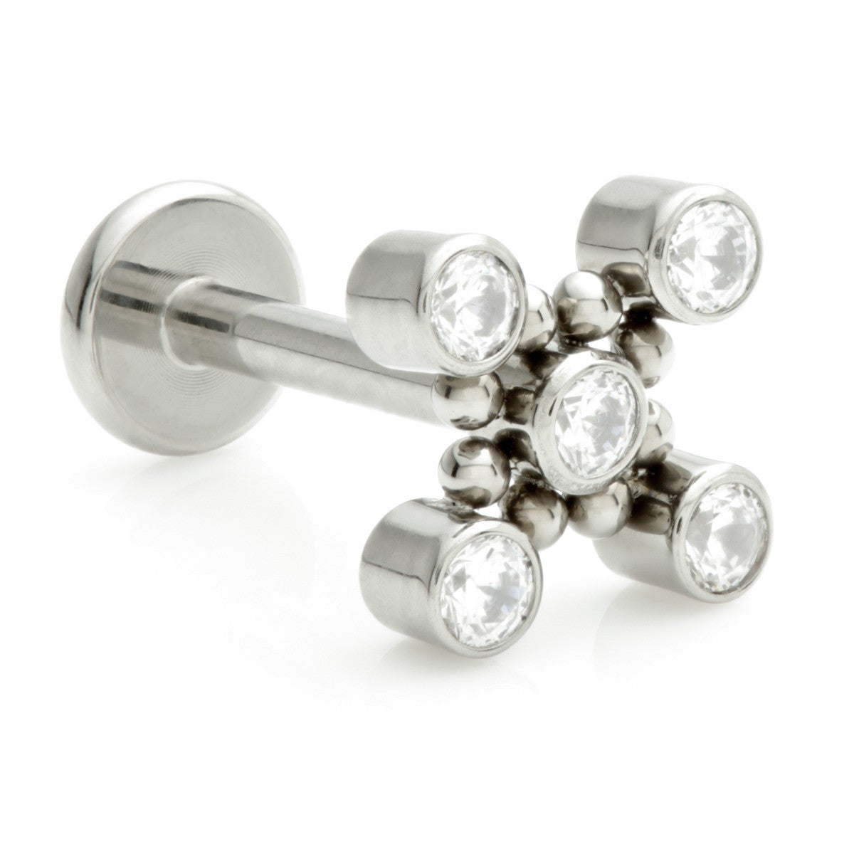 Titanium Internal Labret with Jewelled Bezel Flower with Surrounding Beads Attachment Gauge: 1.2mm (0.9mm thread) Size: 6mm / 8mm Gem Colour: CR CZ Gem Stones Medical Grade Titanium 6Al-4VEli ASTM:F-136