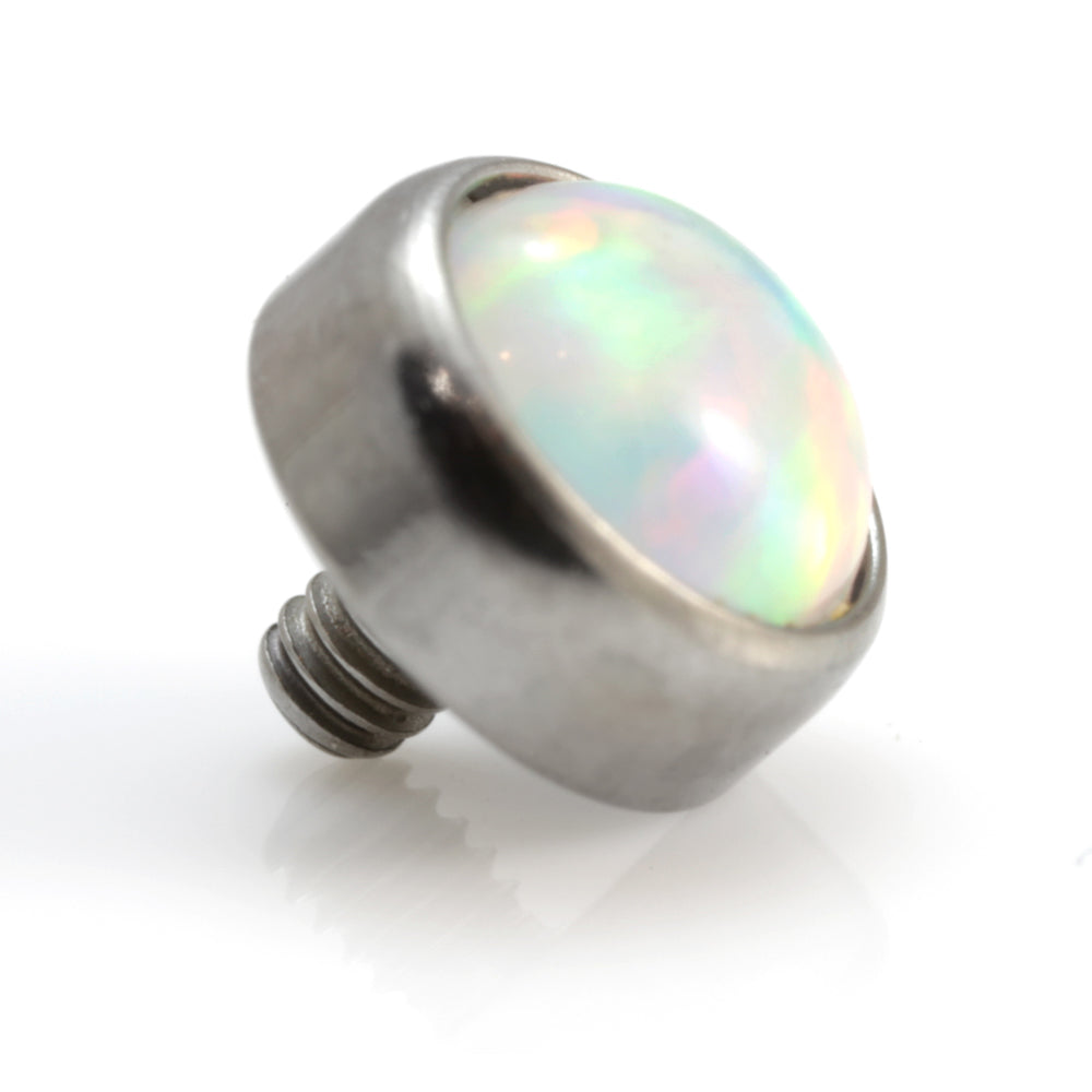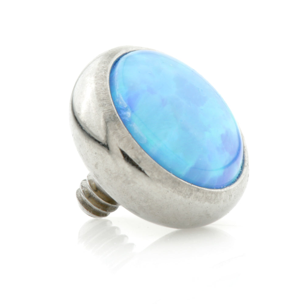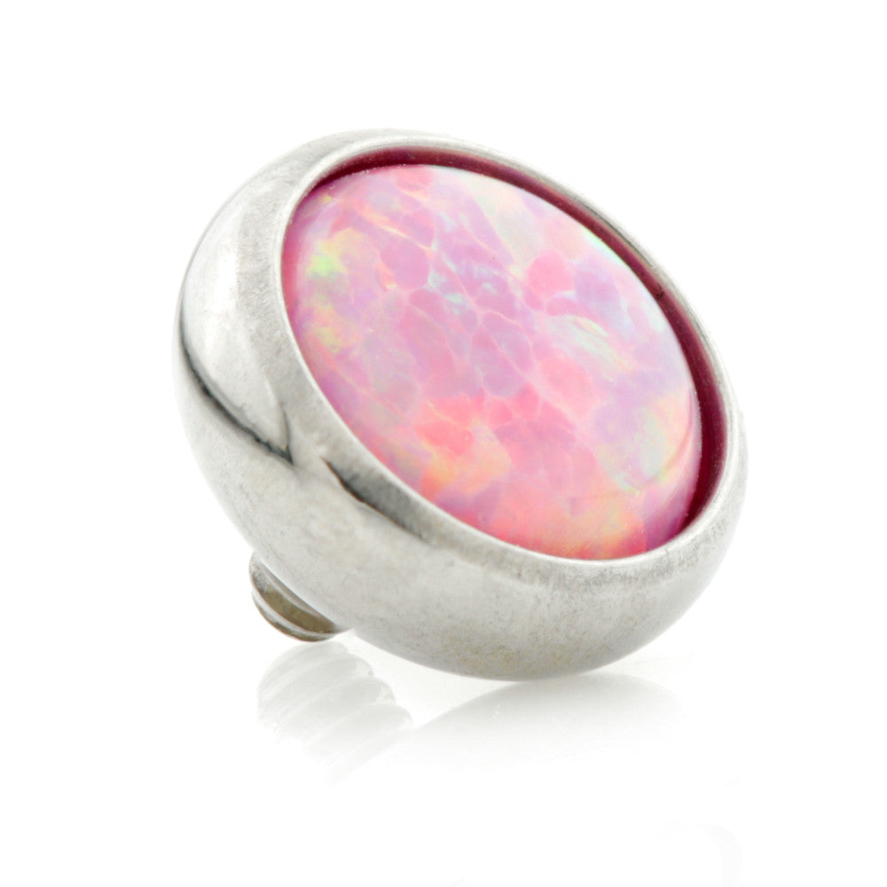Synthetic Opal on Ti Internal Thread Disk 0.9mm thread fits 1.2mm gauge Opal Colours: Pink, Blue, White Disk Sizes: 3mm, 4mm, 5mm Medical Grade Titanium 6Al-4VEli ASTM:F-136