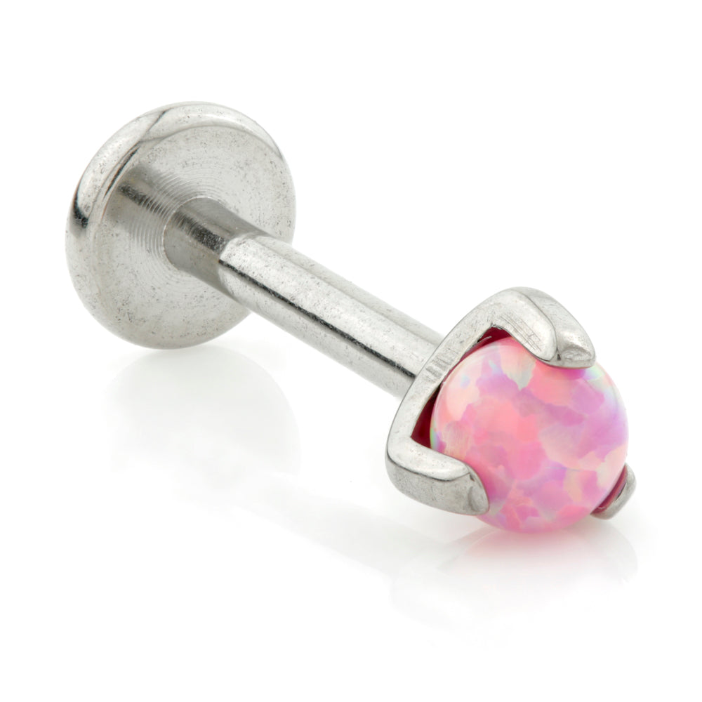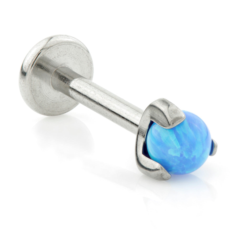 Ti Internal Thread Micro Labret with Opal Prong Set Ball Gauge: 1.2mm Size: 8mm Opal Size: 3mm Opal Colour: Blue, Pink or White Titanium Colours Available Medical Grade Titanium 6Al-4VEli ASTM:F-136