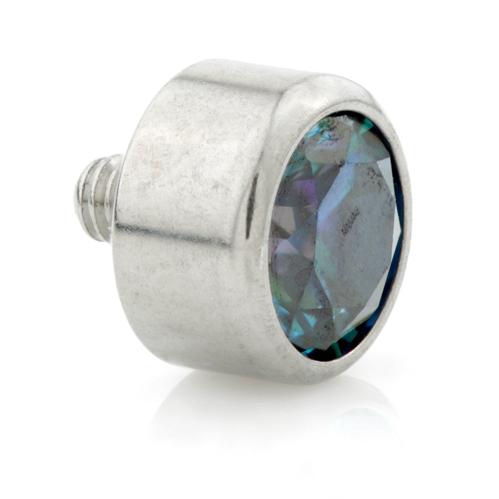 Titanium Bezel Set Gem Attachment Gauge: 1.6mm with 1.2mm thread Crystal or Blue Gem Gem Size: 4mm Titanium Colours Available Swarovski Crystal Gem Stones Medical Grade Titanium 6Al-4VEli ASTM:F-136