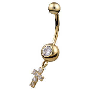Crystal Gem Cross Drop Belly Bar in 9ct Gold Sizes Available: 8mm & 10mm Ball Size: 4.5mm weight: 1.29gms & 1.37gms