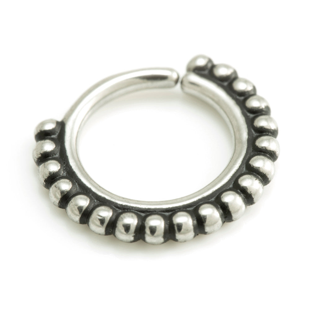 Open by hand (this particular design is more difficult to open as it is thicker than the other designs) Seamless Septum / Ear Rings in Bohemian designs. Made from cast steel - annealed for opening Sizes: 0.8mm x 6/7/8mm, 1.2mm x 6/7/8mm Can also be worn through tunnels