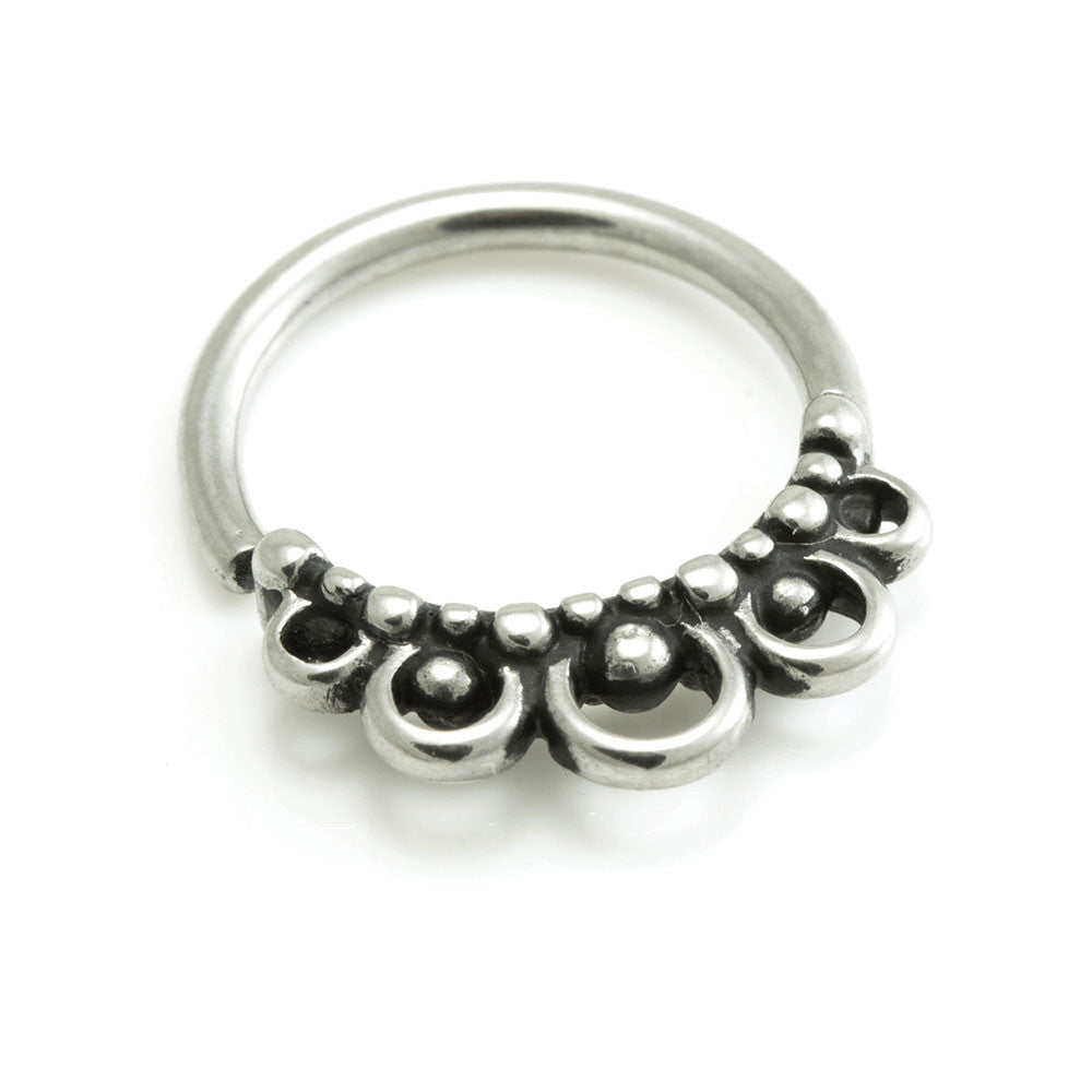 Open by hand - Seamless Septum / Ear Rings in Bohemian designs Made from cast steel - annealed for easy opening Sizes: 0.8mm x 7/8mm, 1mm x 7/8mm, 1.2mm x 10mm Can also be worn through tunnels
