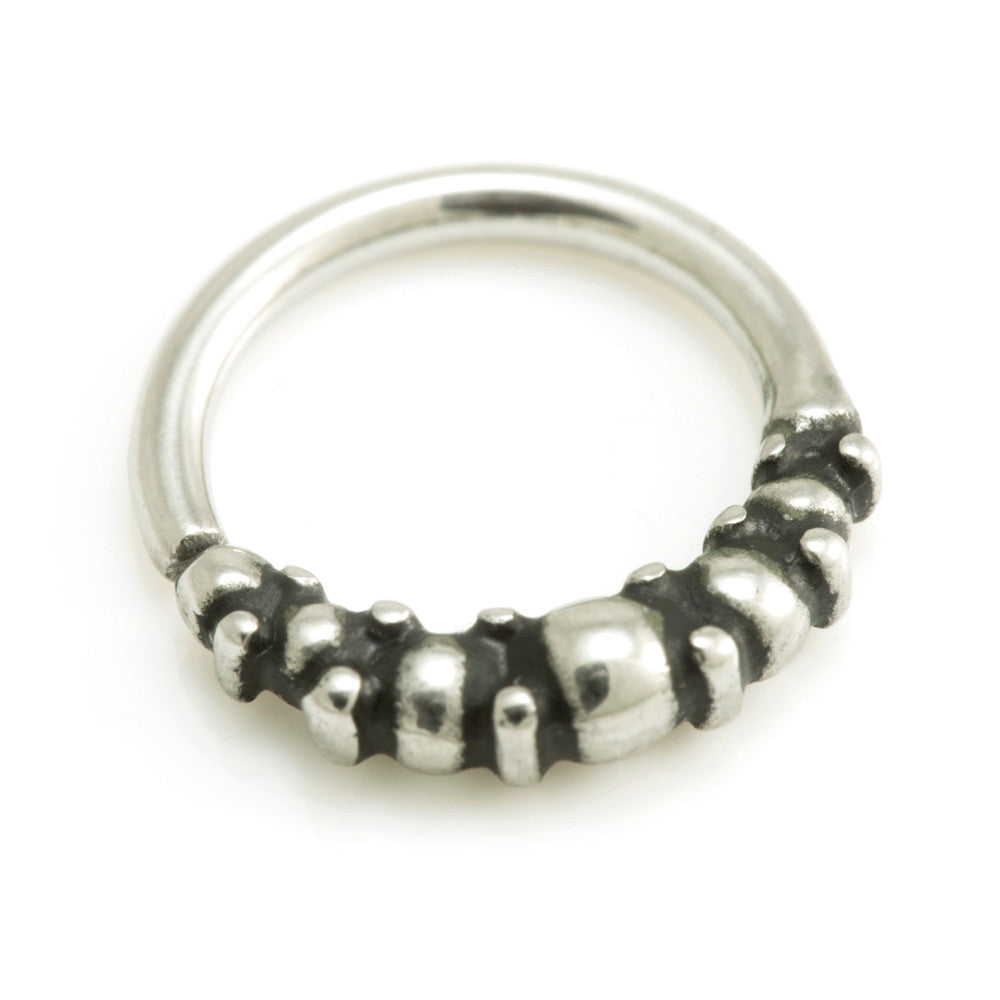 Open by hand - Seamless Septum / Ear Rings in Bohemian designs Made from cast steel - annealed for easy opening Sizes: 0.8mm x 7/8mm, 1mm x 7/8mm, 1.2mm x 8/10mm Can also be worn through tunnels
