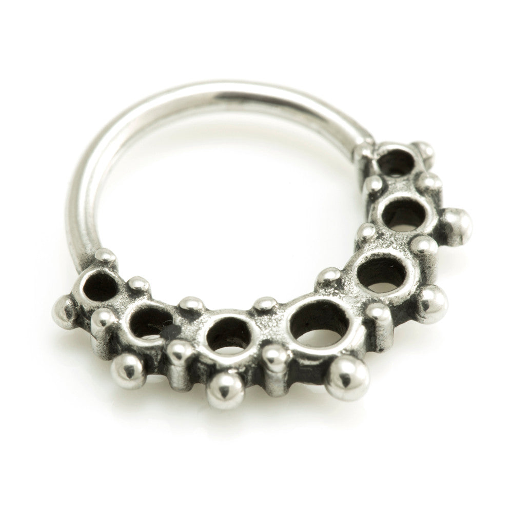 Open by hand - Seamless Septum / Ear Rings in Bohemian designs Made from cast steel - annealed for easy opening Sizes: 0.8mm x 7/8mm, 1mm x 7/8mm, 1.2mm x 8/10mm Can also be worn through tunnels