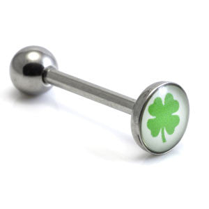 Surgical Steel Tongue Stud with logo design Designs: Heart/Cherries/Girlie Skull/Cannabis/Hologram Heart/Mushroom/Smiley/F*ck You/St Georges/Union Jeck/8 Ball/Scottish Flag/69/Shamrock/Welsh Dragon/White Star/Heart Cherries/LOVE/BITCH/Red Star/Skull Cherries/Lick Me/Cartoon Skull/BABE/Black Star/Skull/Pink Leopard/Sugar Skull/Zebra/Check Gauge: 1.6mm. Length: 12mm, 14mm or 16mm Disk size: 8mm