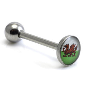 Surgical Steel Tongue Stud with logo design Designs: Heart/Cherries/Girlie Skull/Cannabis/Hologram Heart/Mushroom/Smiley/F*ck You/St Georges/Union Jeck/8 Ball/Scottish Flag/69/Shamrock/Welsh Dragon/White Star/Heart Cherries/LOVE/BITCH/Red Star/Skull Cherries/Lick Me/Cartoon Skull/BABE/Black Star/Skull/Pink Leopard/Sugar Skull/Zebra/Check Gauge: 1.6mm. Length: 12mm, 14mm or 16mm Disk size: 8mm