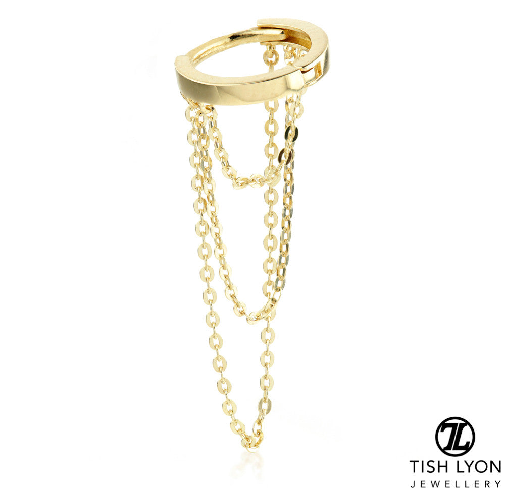 TISH LYON® - Chained Hinge Ring - Chains hang over side of ear or from lobe 14ct Yellow Gold Gauge: 1.2mmSize: 8mm Weight: 0.75gms For Cartilage, Lobe, etc 14ct Suitable for initial piercing Laser Mark - TL