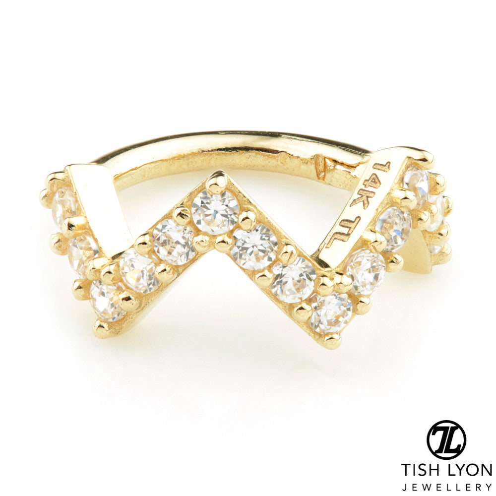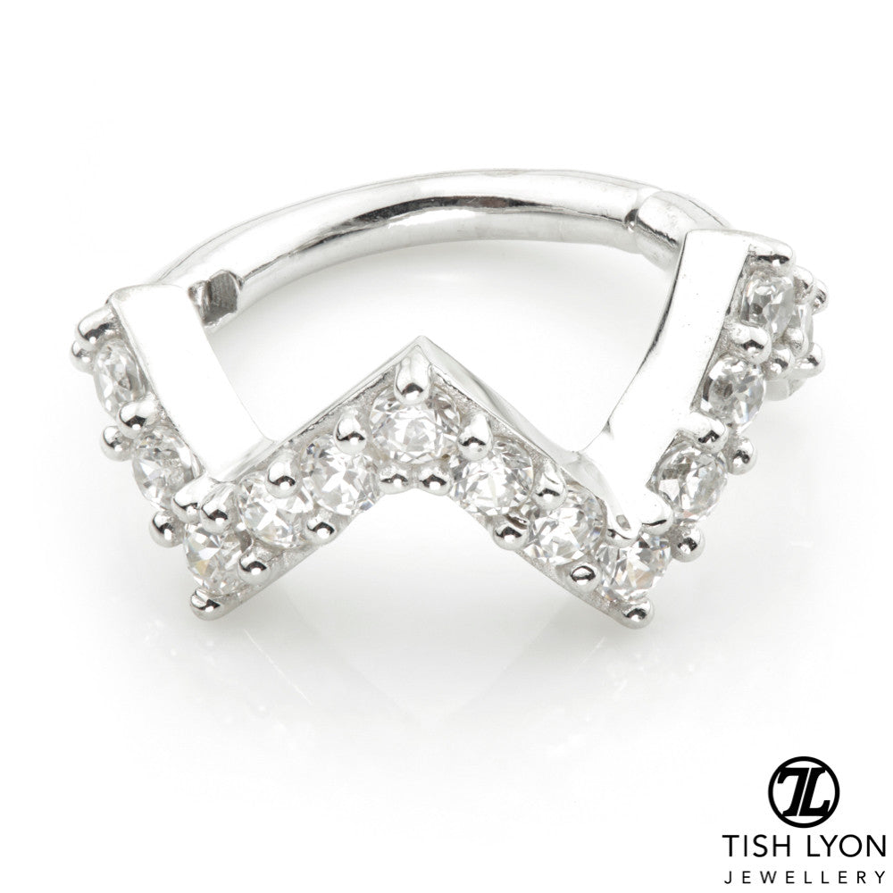 TISH LYON - Gold Pave Gem Zig-Zag Hinge Ring 14ct or 9ct Gold White or Yellow Gold CZ Crystal Gems (1.4mmx14) Size: 1.2mm x 8mm For Septum, Cartilage, Tragus, Rook, etc Packaged in small grey presentation box 14ct Suitable for initial piercing Laser Mark on Zig-Zag