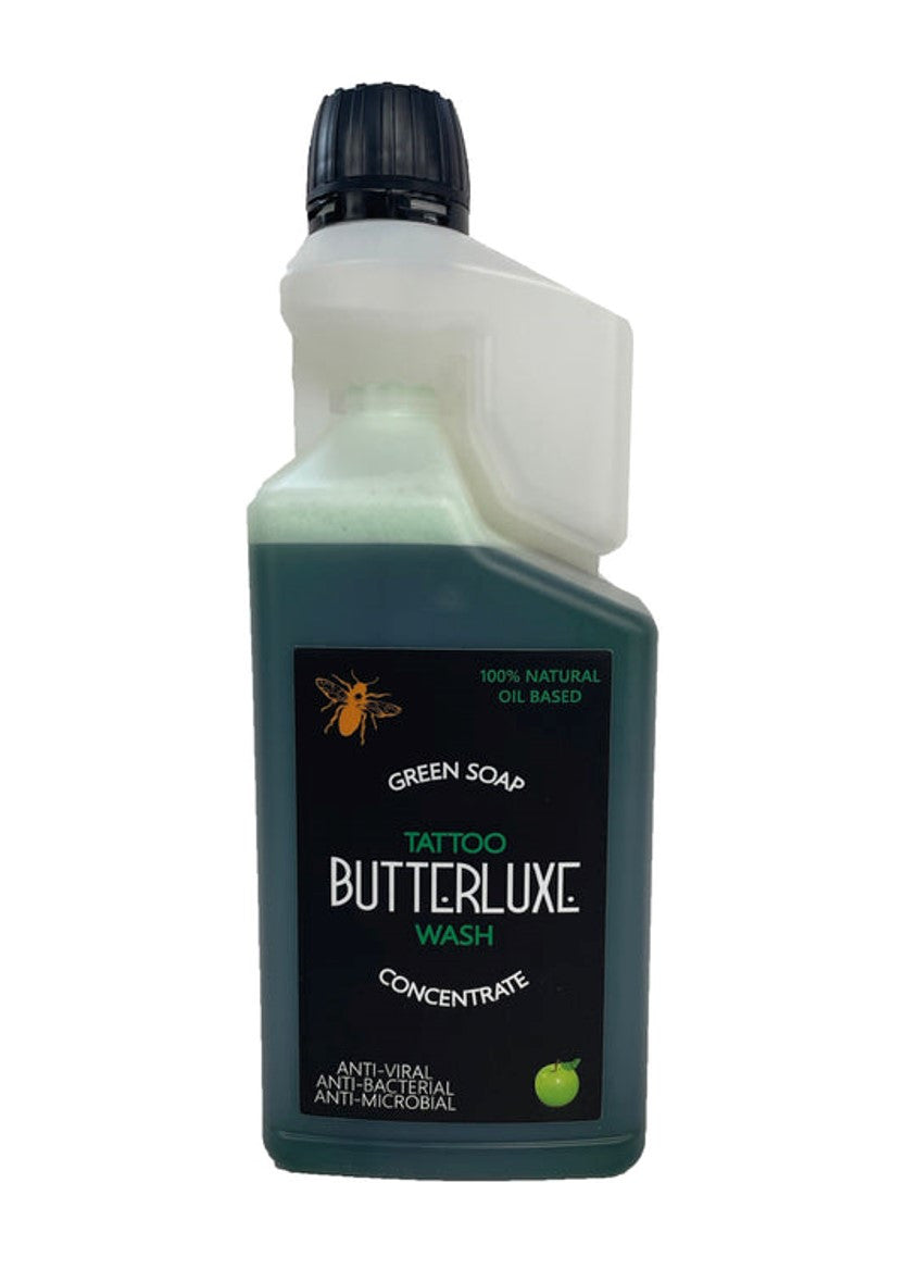 Butterluxe Green Soap Concentrate is enriched with aloe vera extract and organic essential oils designed to soothe and calm the skin. Packed with anti-bacterial and Anti-inflammatory properties. Effectively removes excess ink whilst soothing the affected area. Contains Chlorhexidine, one of the worlds most effective disinfectants. Complies with BS EN 1276, BS EN 13697, BS EN 16615 (Keeping your local authority happy!) Mix 1 part concentrate to 15 parts distilled water. INGREDIENTS: Aqua, Lauramine Oxide, Glycerine, Chlorhexidine Digluconate 2% And Essential Oils.