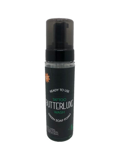 Butterluxe Ready To Use Green Soap Foam Packed with anti-bacterial and anti-inflammatory properties. Effectively removes excess ink whilst soothing the affected area. Contains Chlorhexidine, one of the worlds most effective disinfectants. Packed with Anti-Microbial Properties! 100% Natural Oil Based! Complies with BS EN 1276, BS EN 13697, BS EN 16615 (Keeping your local authority happy!) Shake well, use directly from bottle INGREDIENTS: Aqua, Lauramine Oxide, Glycerine, Chlorhexidine Digluconate 2% And Essential Oils. Manufactured under license, for safety data sheet contact: info@butterluxe.co.uk