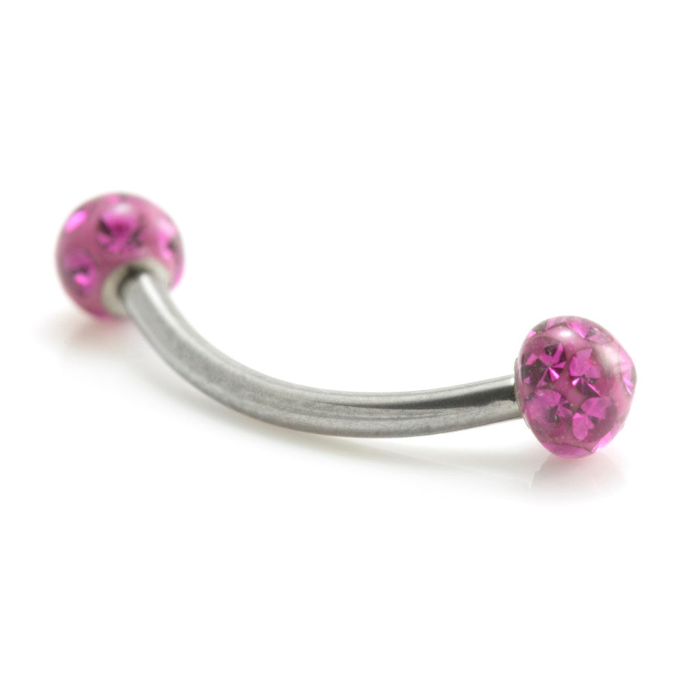 Titanium Curved Internal Thread Microbar with Double Multi Gem Resin Coated Balls Gauge: 1.2mm (thread on ball 0.9mm)Sizes: 6/7/8/10mmBall Sizes: 1.2mm x 3mmColours: Crystal, Rose, Aqua, AB Medical Grade Titanium 6Al-4VEli ASTM:F-136This product cannot be autoclaved.