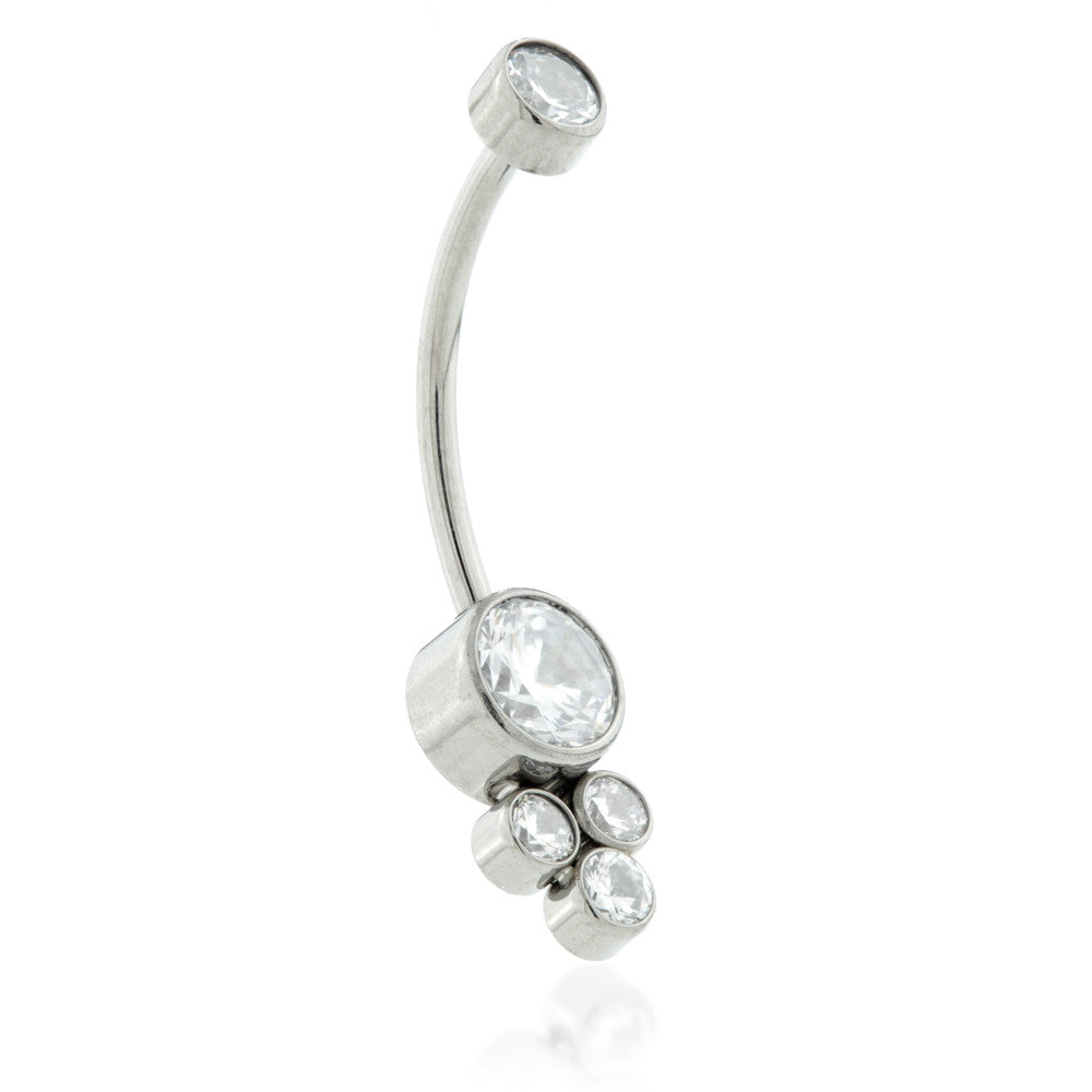 Internal Ti Jewelled Quad Disk Navel Gem Colour: Crystal Sizes: 1.2mm x 10/14mm Disk Sizes: 4mm + 6mm 1.6mm gauge with 1.2mm internal thread Fits QDD attachments Medical Grade Titanium 6Al-4VEli ASTM:F-136
