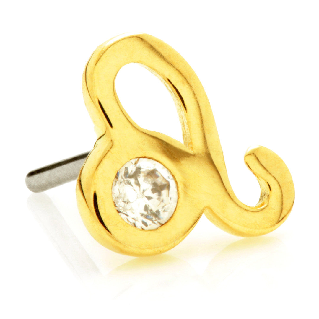 TISH LYON® 14ct Solid Gold Threadless Jewelled Zodiac Leo Pin Attachment Gauge: 1.0/1.2/1.6mm (0.5mm threadless) Size: 4mm x 5mm Gem Colour: CR CZ Gem Stones Suitable for initial piercing Packaged in small grey presentation box