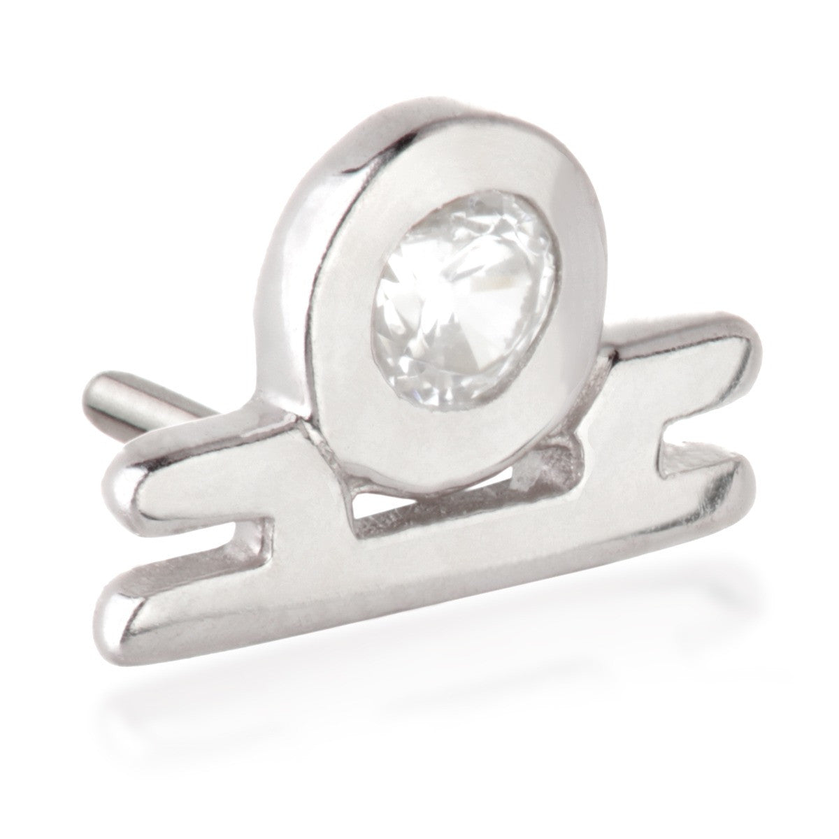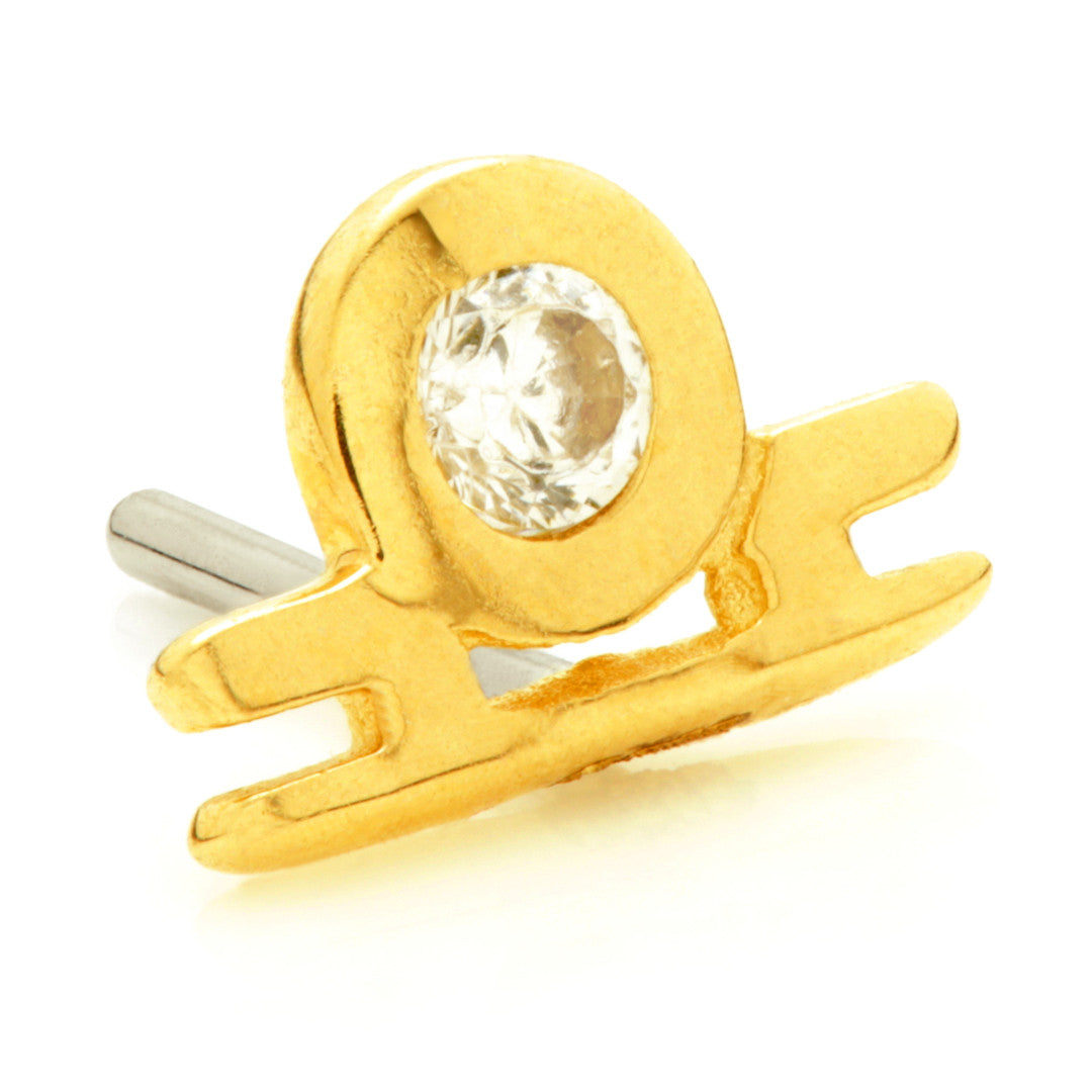 TISH LYON® 14ct Solid Gold Threadless Jewelled Zodiac Libra Pin Attachment Gauge: 1.0/1.2/1.6mm (0.5mm threadless) Size: 3.5mm x 5mm Gem Colour: CR CZ Gem Stones Suitable for initial piercing Packaged in small grey presentation box