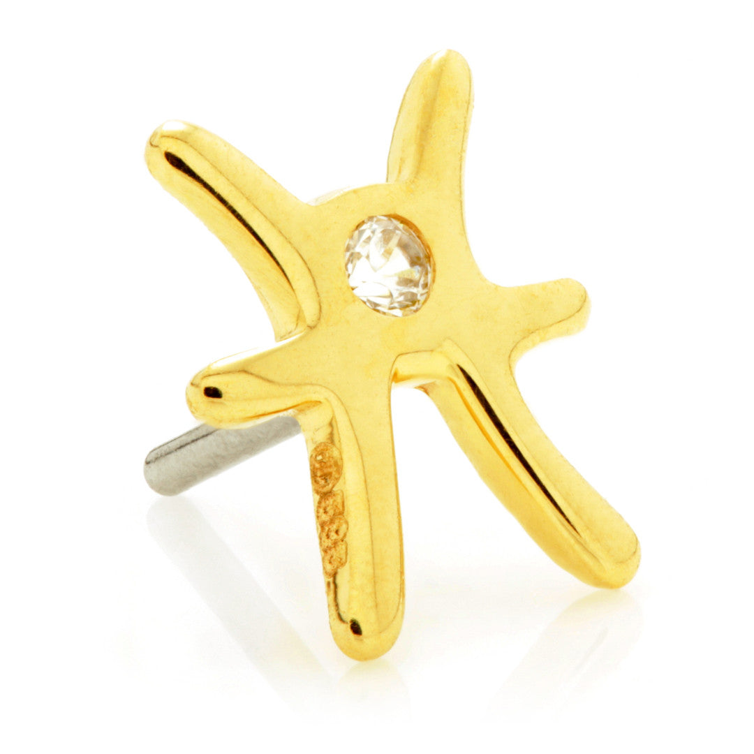 TISH LYON® 14ct Solid Gold Threadless Jewelled Zodiac Pisces Pin Attachment Gauge: 1.0/1.2/1.6mm (0.5mm threadless) Size: 4mm x 5mm Gem Colour: CR CZ Gem Stones Suitable for initial piercing Packaged in small grey presentation box