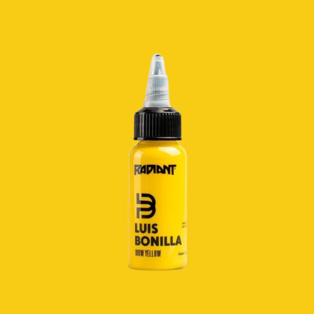Wow Yellow from the https://www.wholesalebodyjewellery.com/tattoo-supplies/product/tattoo-inks/radiant/bonilla.html Luis Bonilla Range . A strong force of yellow that leaves quite an impact. Single bottle of https://www.wholesalebodyjewellery.com/tattoo-supplies/product/tattoo-inks/radiant.html Radiant Ink . Available in 1oz. Sterilised, easy to apply, pure, uncut homogenised pigment.