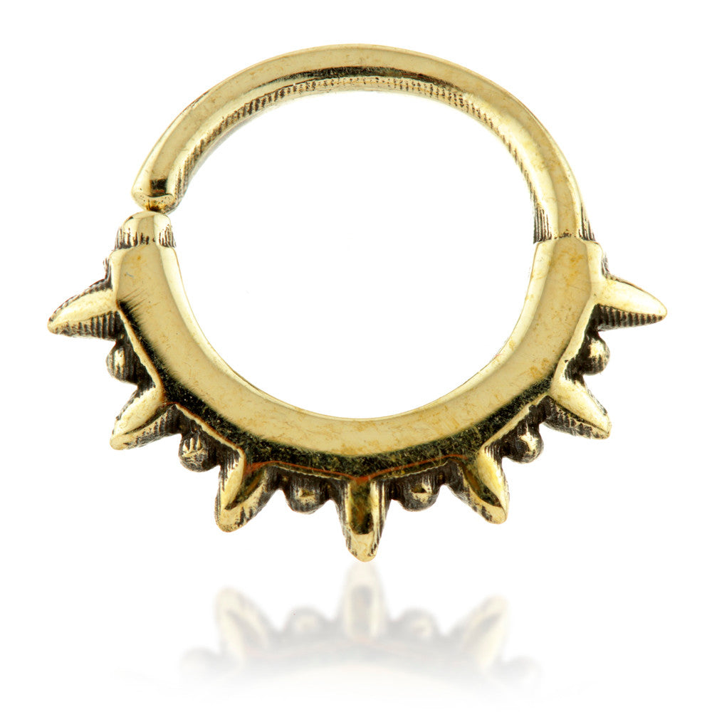 Spike Cartilage Brass Open Ring Gauge: 1.2mm / 16g Internal Diameter: 6mm and 8mm (approx) Not for initial piercing, only to be worn in healed piercings