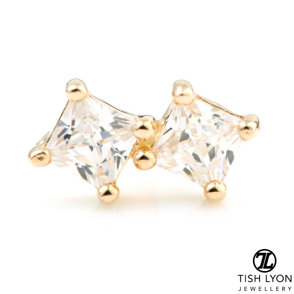 TISH LYON® 9ct or 14ct Gold Double Square Gems Micro Barbell Gem Size: 4x4 (x2) Size : 1mm x 6mm or 1.2mm x 6mm or 8mm Ball: 3mm Laser Marked on Ball (not on bar) 14ct Suitable for initial piercing