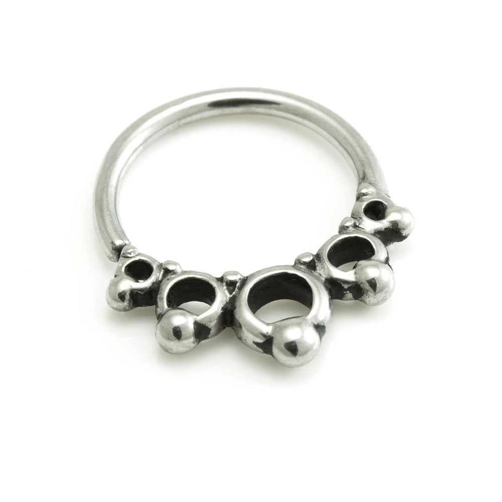 Open by hand - Seamless Septum / Ear Rings in Bohemian designs Made from cast steel - annealed for easy opening Sizes: 0.8mm x 7/8mm, 1mm x 7/8mm, 1.2mm x 8/10mm Can also be worn through tunnels