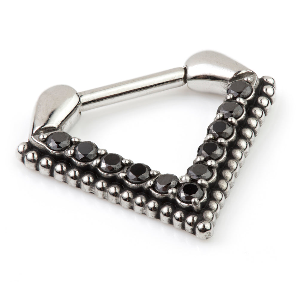 316L Steel Hinged Inverted Jewelled Triangle Steel Septum Ring Size: 1.2mm x 6/8mm Gem Colour: Crystal or Jet (black)
