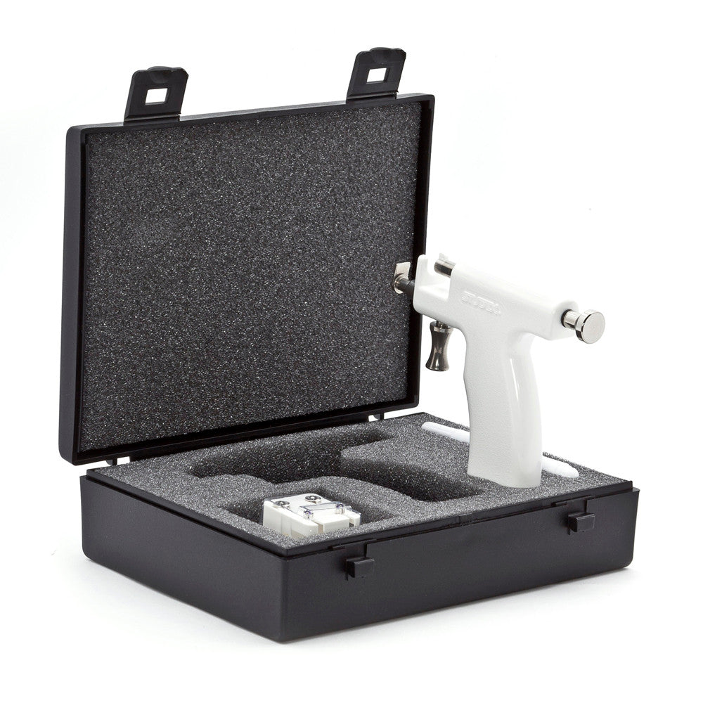 Studex Plus System Gun and Case with instruction manual, marker pen and sample pair of studs.