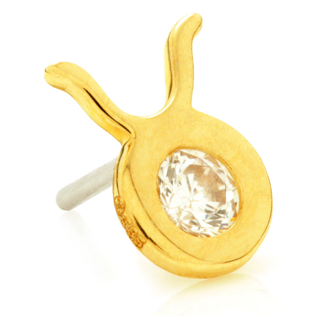 TISH LYON® 14ct Solid Gold Threadless Jewelled Zodiac Taurus Pin Attachment Gauge: 1.0/1.2/1.6mm (0.5mm threadless) Size: 4mm x 5mm Gem Colour: CR CZ Gem Stones Suitable for initial piercing Packaged in small grey presentation box