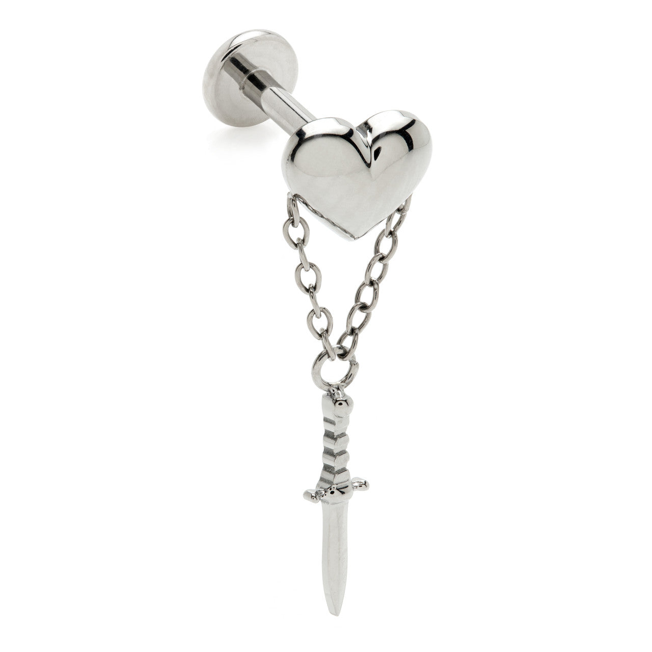 Ti Internal Heart With Hanging Dagger Labret Gauge: 1.2mmSize: 8mm Medical Grade Titanium 6Al-4VEli ASTM:F-136