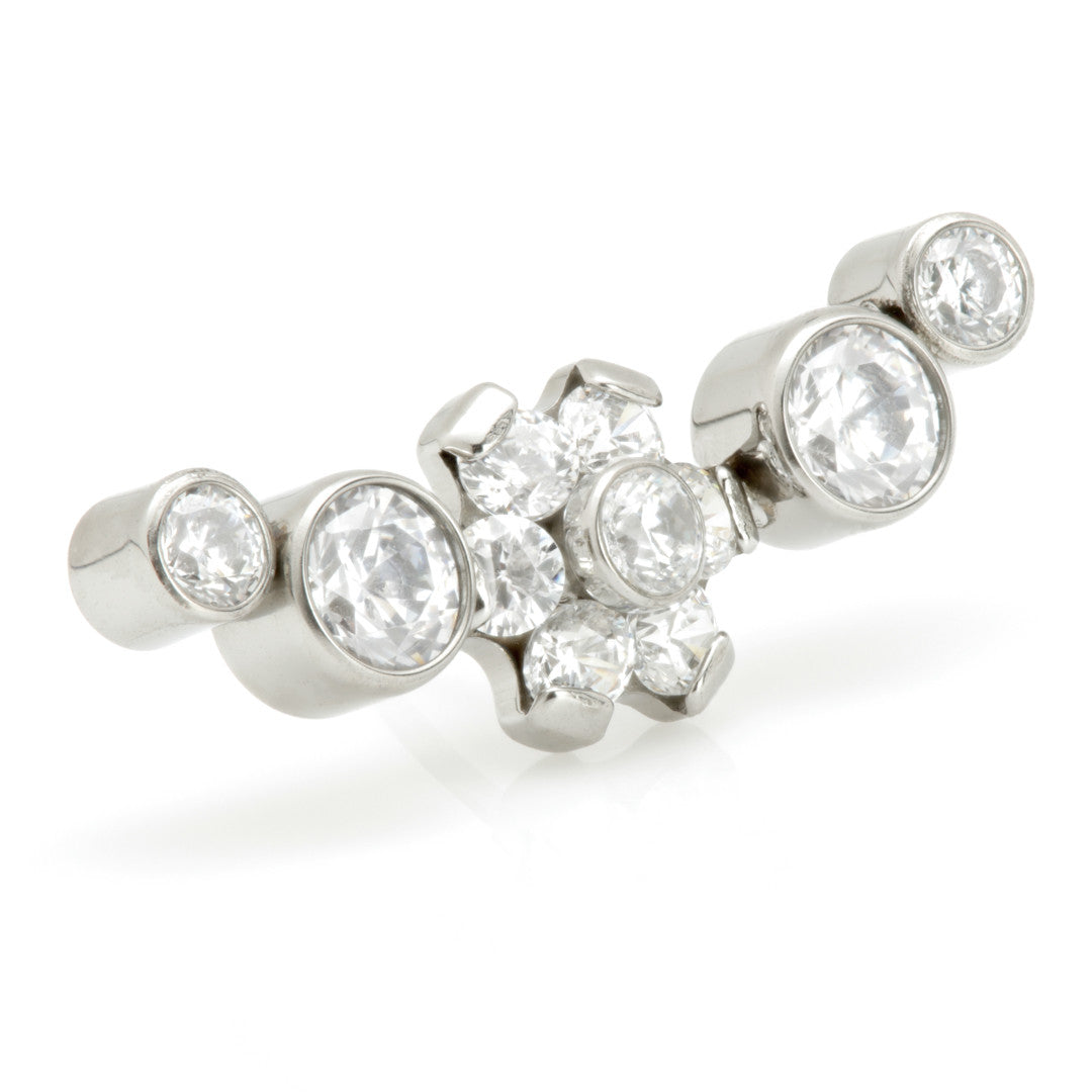 Titanium Threadless Bezel Cluster with Flower Center Attachment Gauge: 1.0/1.2/1.6mm (0.5mm threadless) Size: 5mm x 14mm Gem Colour: CR CZ Gem Stones Medical Grade Titanium 6Al-4VEli ASTM:F-136