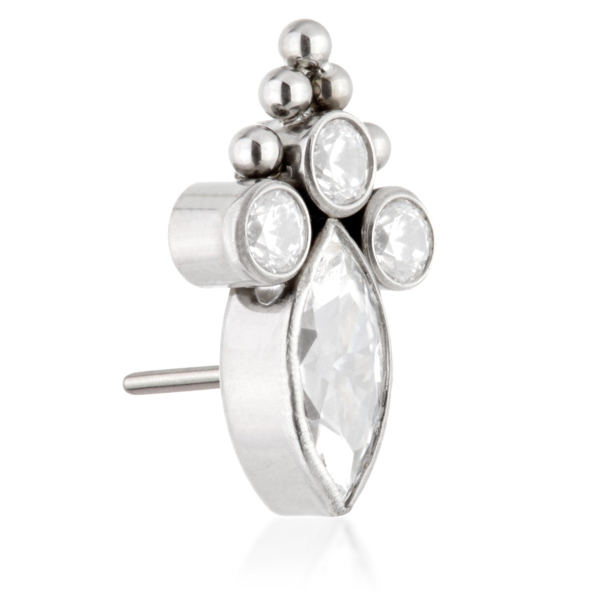 Titanium Threadless Jewelled Bezel Marquise with Triple Gem and Beads Top Attachment Gauge: 1.2mm (0.5mm threadless) Gem Colour: CR CZ Gem Stones Medical Grade Titanium 6Al-4VEli ASTM:F-136