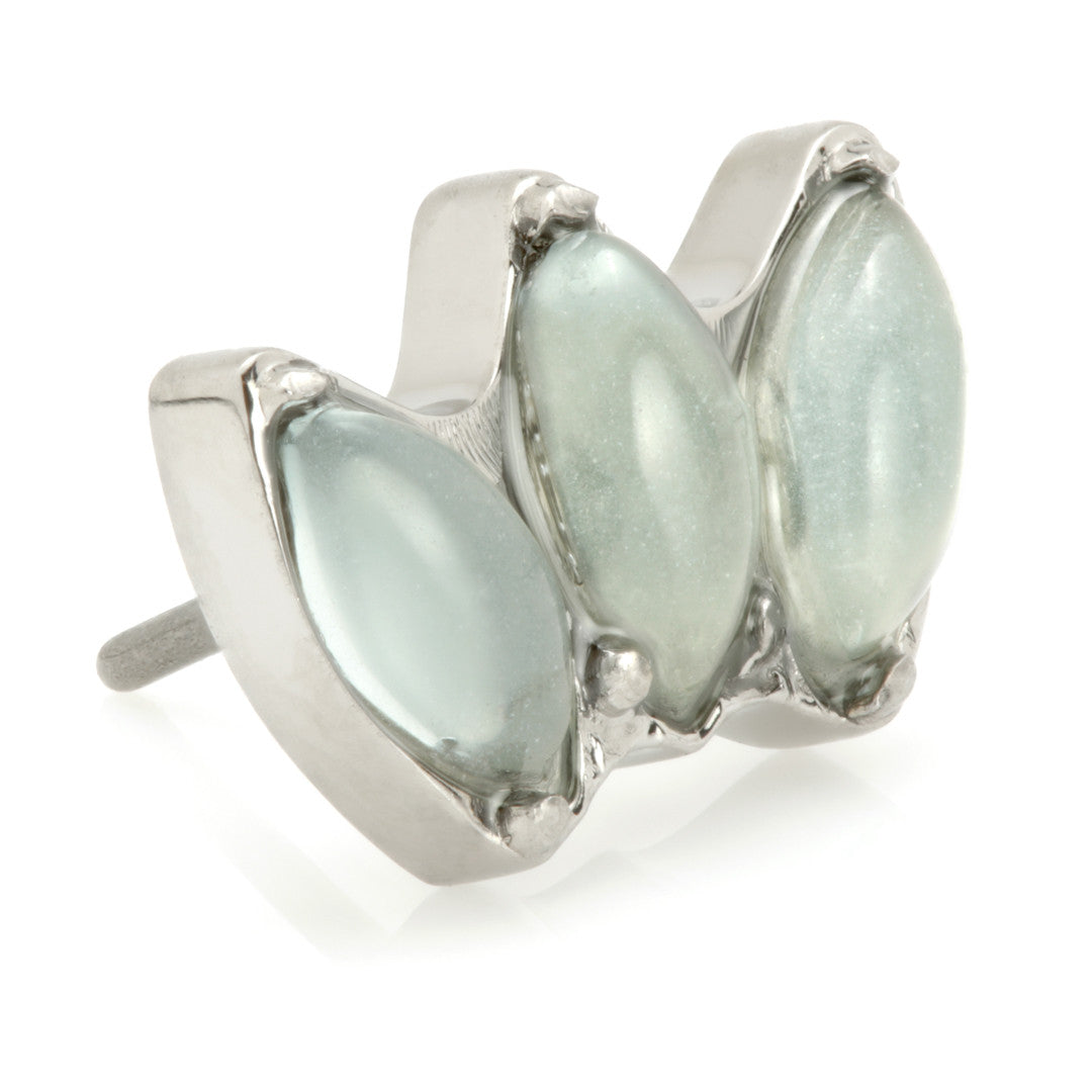 Ti Threadless Triple Marquise Attachment with Aquamarine Stone Gauge: 1.0/1.2/1.6mm (0.5mm threadless) Size: 5mm x 8mm Stone Size: 1.5mm x 3mm Stone: Aquamarine Medical Grade Titanium 6Al-4VEli ASTM:F-136