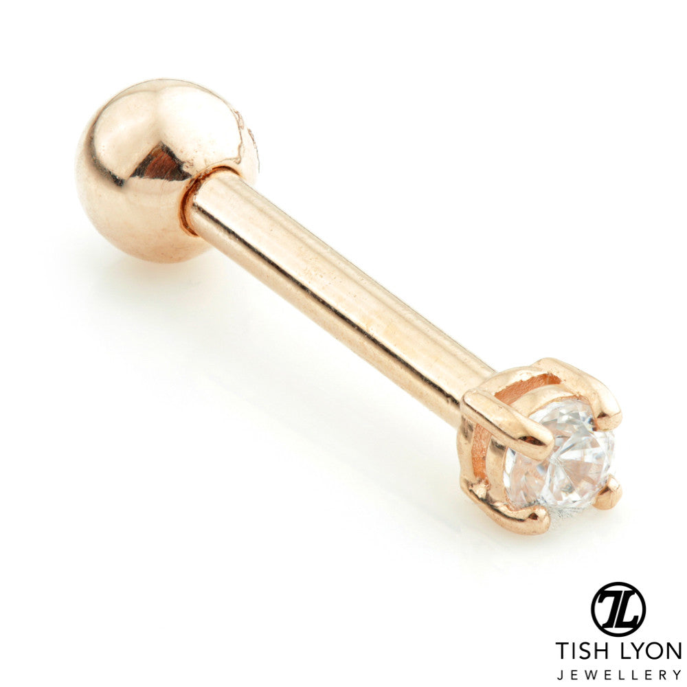 TISH LYON® Gold Prong Gem Microbar 9ct or 14ct Gold Cartilage Ear Bar Colour: Yellow, White or Rose Gem Prong: 2mm approx Sizes: 1.2mm x 8mm (3mm ball) Laser Mark 14ct Suitable for initial piercing