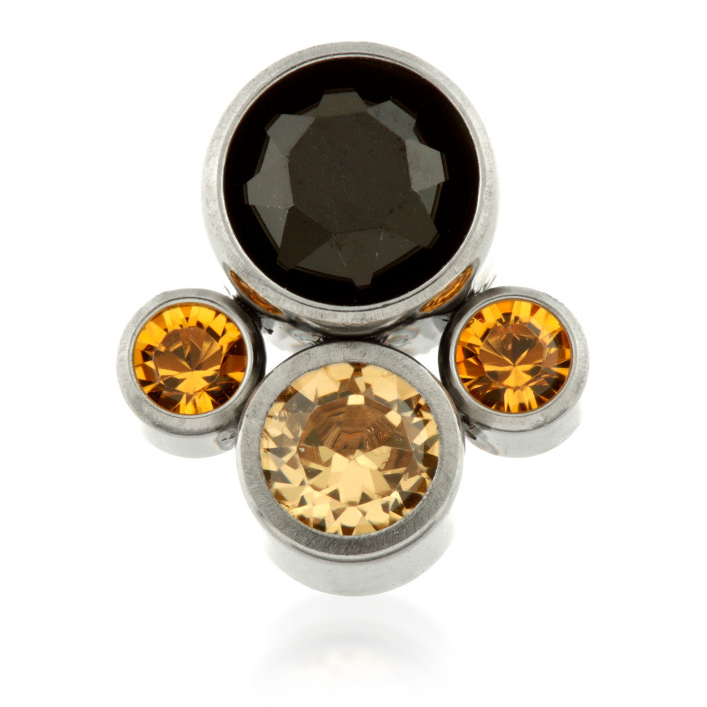 Titanium Quad Gem attachment Gauge 1.2mm with 0.9mm thread Large Jet Gem, Medium Champagne Gem & Small Topaz Gems Gem Sizes: 4mm, 3mm, 1.5mm (attached disks) Titanium Colours Available Swarovski Crystal Gem Stones Medical Grade Titanium 6Al-4VEli ASTM:F-136