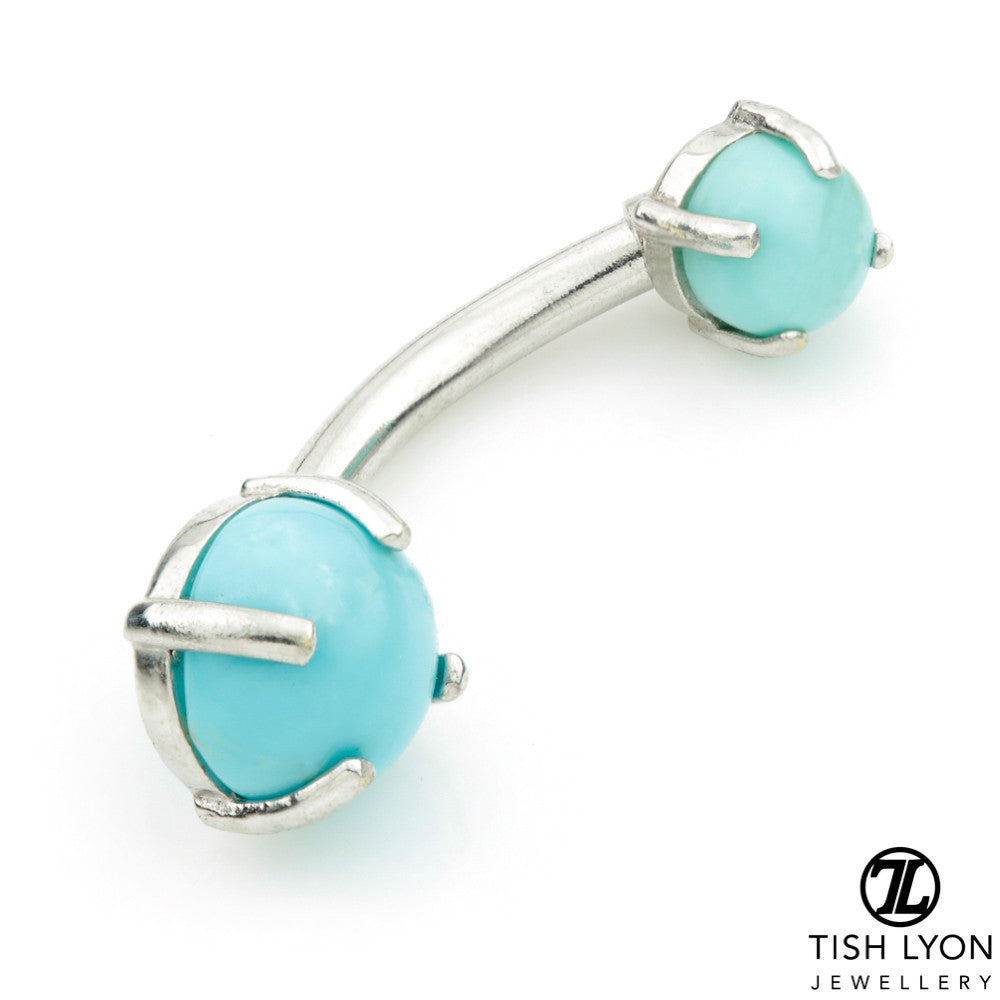 TISH LYON® - Prong Cabochon Turquoise Gold Round Navel Turquoise Grade: A+ stone cabochon 6mm (main stone) / 4mm (top stone) Turquoise (Natural Stone) Size: 1.6mm x 8mm or 10mm Belly Bars Do Not Autoclave (stone may crack with heat) Laser Mark - 14K TL