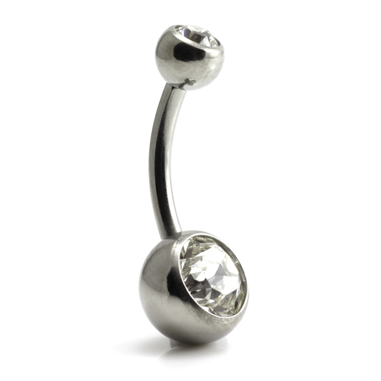 Titanium External Thread Double Jewelled Navel UK Made Gauge: 1.2mm / 1.6mm Sizes: 6/8/10/12/14/16mm Ball Size: 5/8mm Swarovski Crystal Gem Stones Gem Colours: AA, AB, AR, AM, AQ, BD, BZ, CB, CR, EM, FU, JT, LA, LR, LS, PE, RS, SA, SI, TO, VL Medical Grade Titanium 6Al-4VEli ASTM:F-136